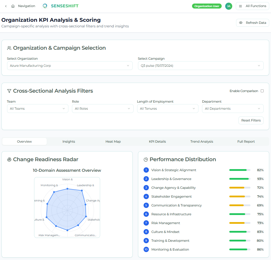 SenseShift tracks your core change-readiness KPIs on intuitive dashboards, with vibrant colour-coded heat maps that instantly reveal where engagement, confidence, and capability are thriving, or starting to falter.