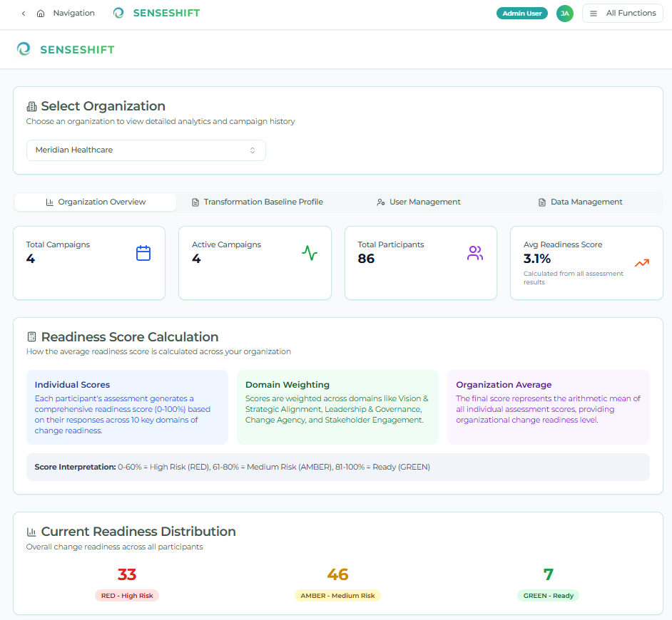 Here are sample screens from the SenseShift platform, your short product tour to see how we transform raw change-readiness data into powerful, game-changing insight that drives results.